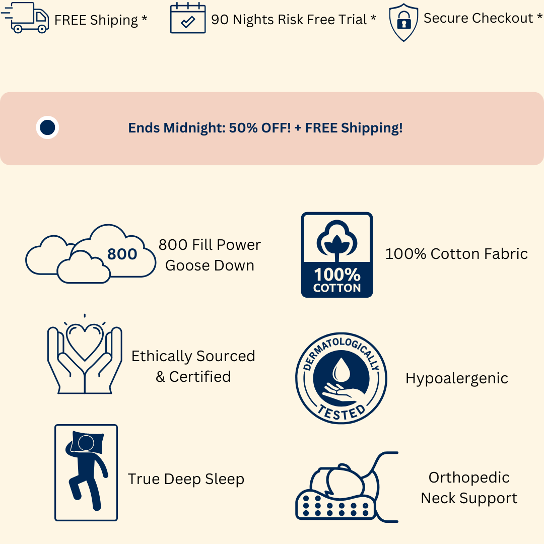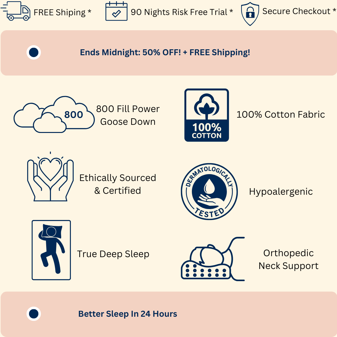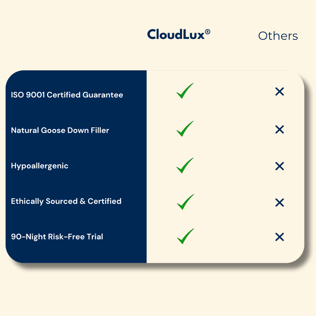Experience the ultimate in sleep comfort with CloudLux® goose down pillows. We guarantee a 30% improvement in your sleep quality, or we'll refund your money, no questions asked. Say goodbye to restless nights and hello to rejuvenating sleep. Try it risk-free today!